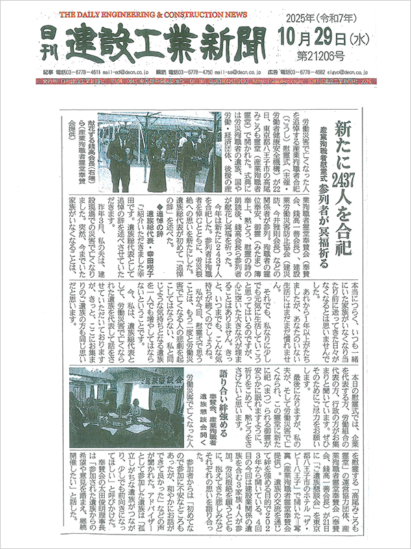 - 産業殉職者合祀慰霊式、ご遺族懇談会が専門紙に掲載されました -