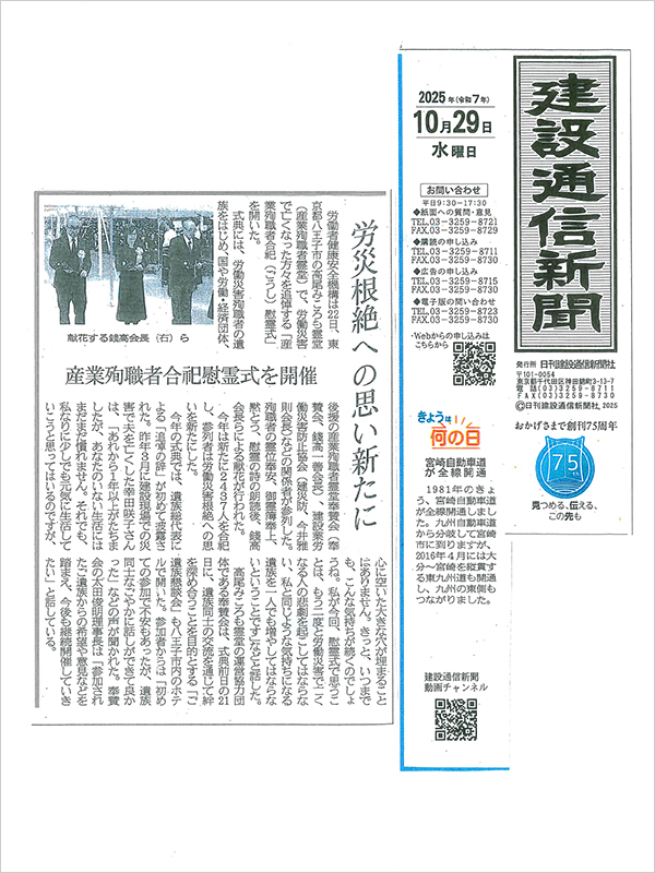 - 産業殉職者合祀慰霊式、ご遺族懇談会が専門紙に掲載されました -